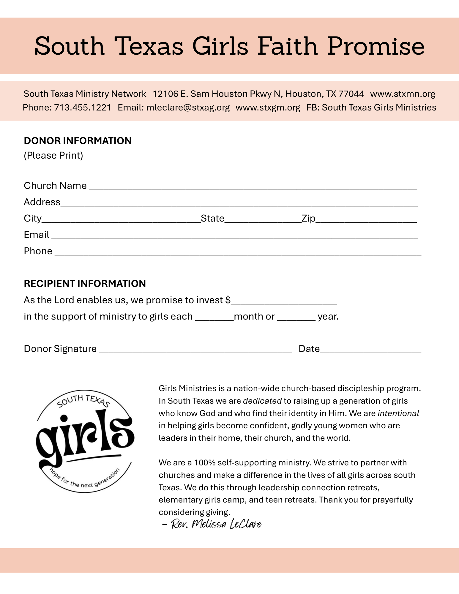 Melissa LeClare at mleclare@stxag.org or send to Girls Ministries at 12106 E Sam Houston Pkwy N Houston, TX 77044